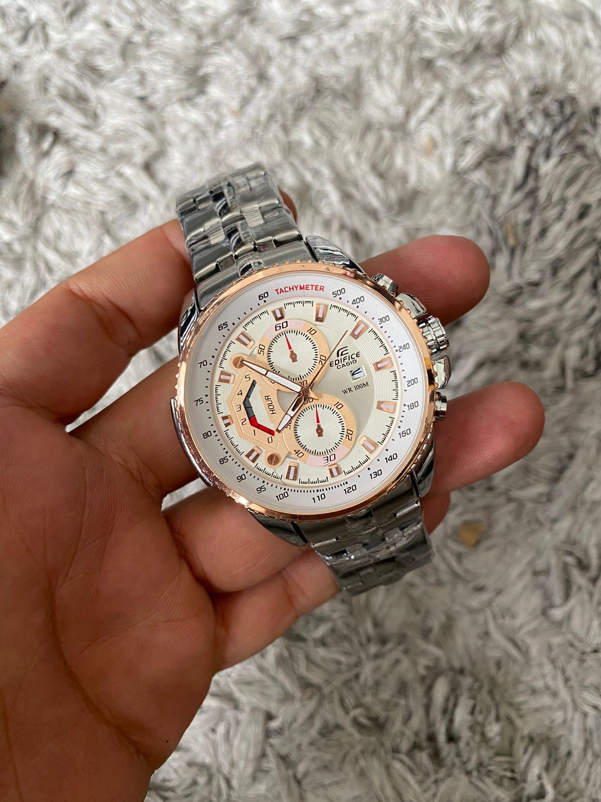 Edifice Cassio Plateado Pantalla Blanca Borde y Detalles Cobre