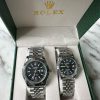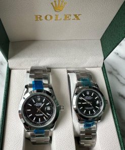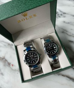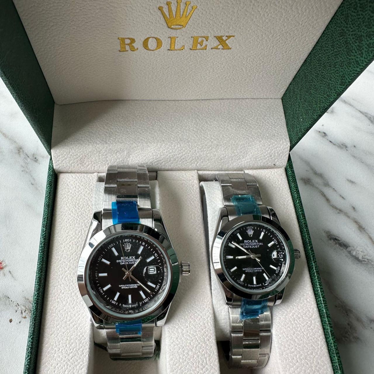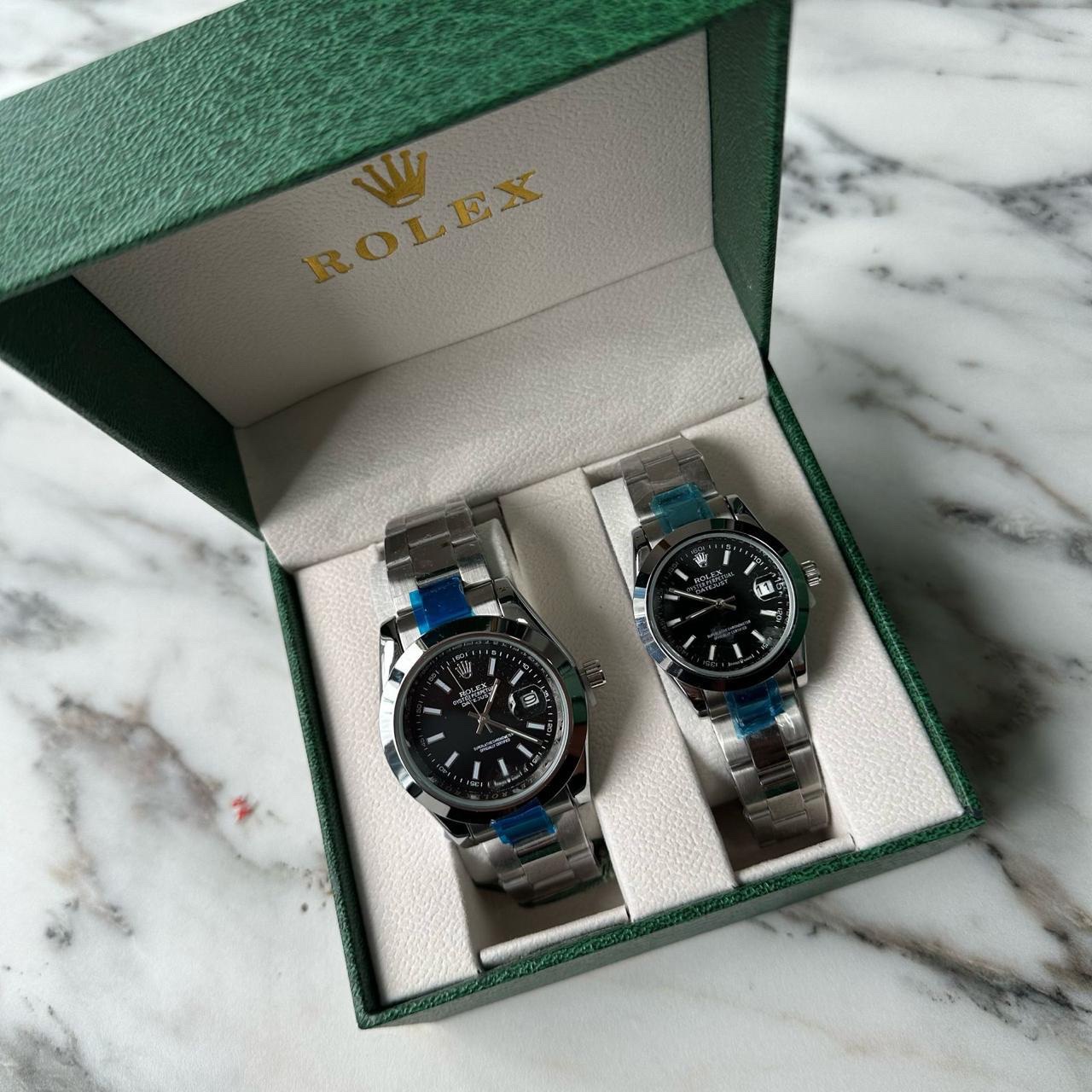 PAREJAS ROLEX COFRE plateada fondo negro correa lisa