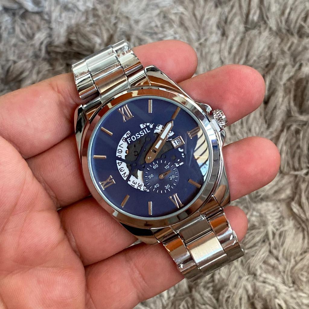 Reloj Acero Caballero Fossil Plateado Fondo Azul Oscuro