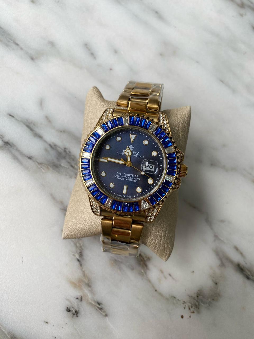 RELOJ ROLEX PIEDRA DORADO FONDO AZUL