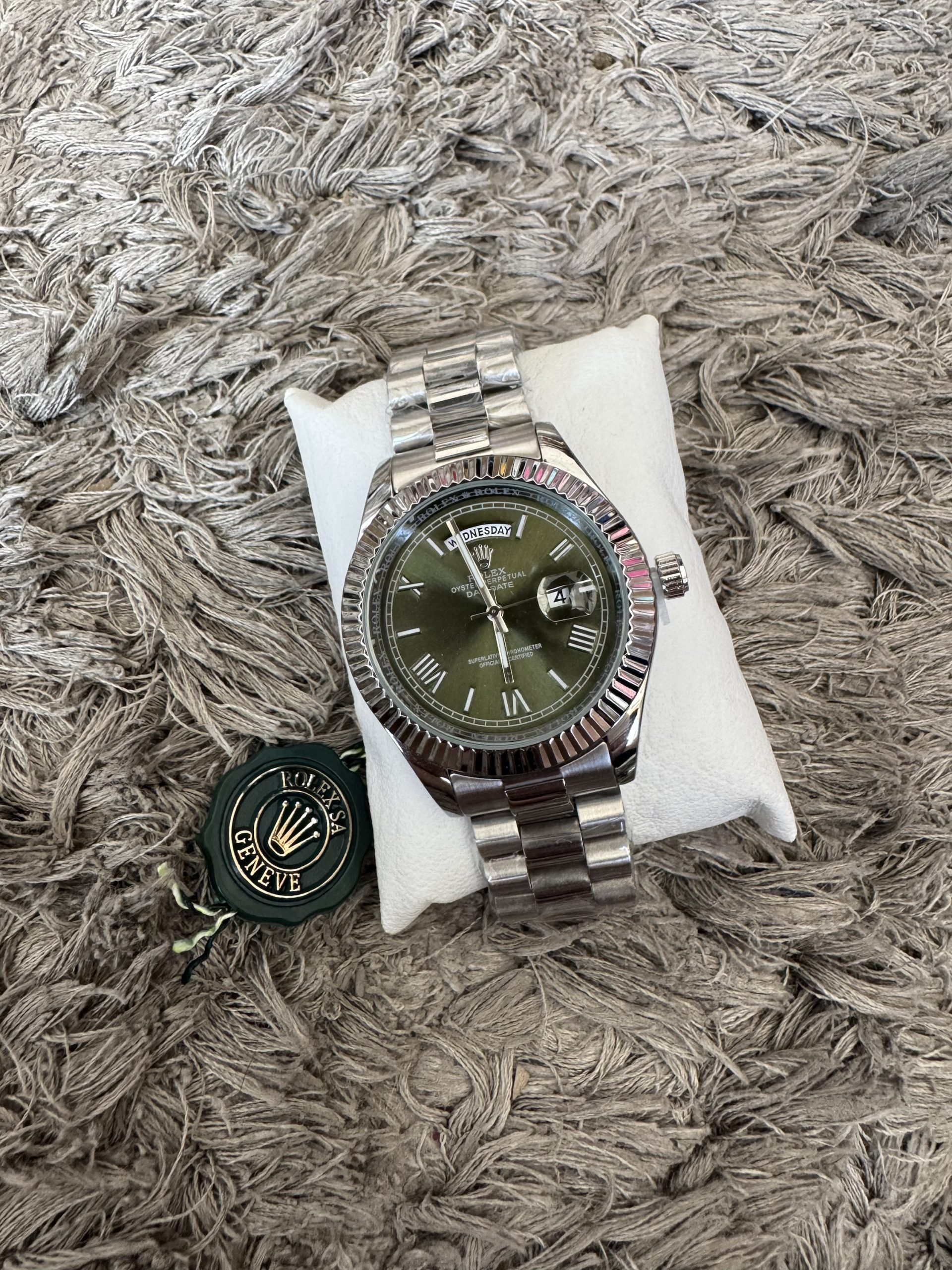 Reloj Rolex Plateado Fondo Verde Oscuro